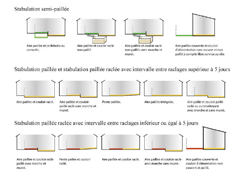 | Caillebotis | Stabulation paillée avec récolte des urines | Stabulation entièrement paillée | Stabulation sur litière accumulée ou biomaîtrisée | |||