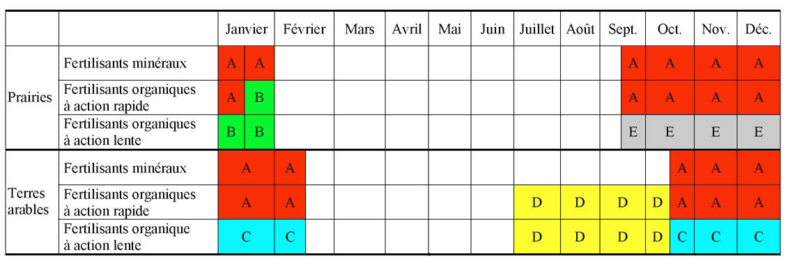 Tableau récapitulatif des périodes d'épandage des fertilisants organiques