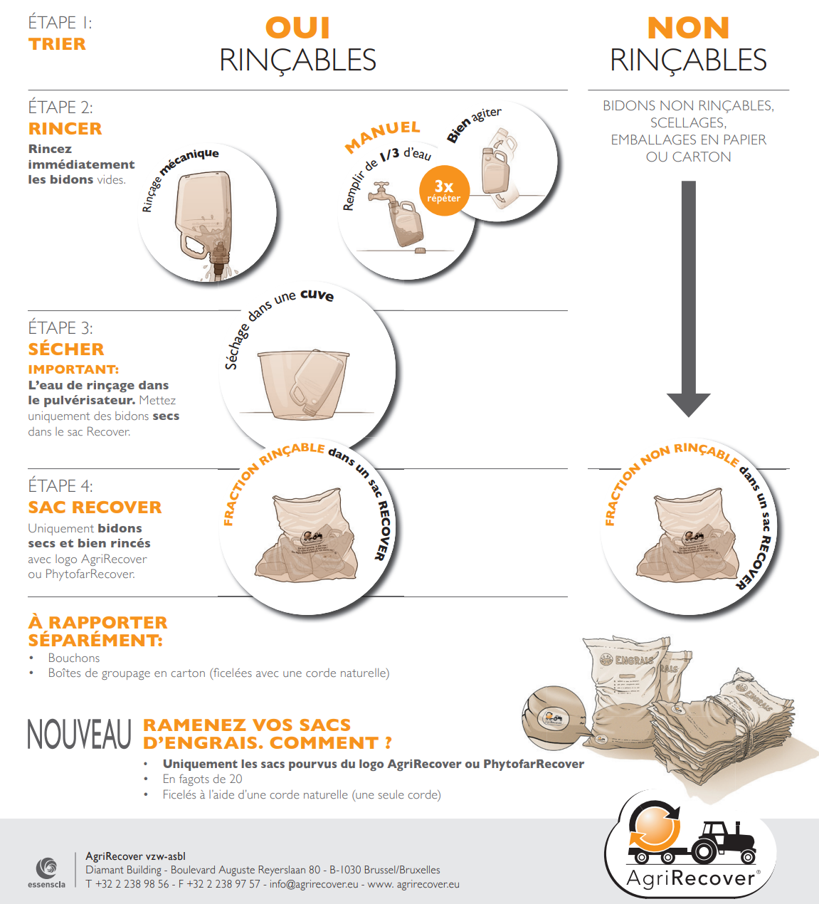 Les sacs d’engrais doivent être propres, munis du logo AgriRecover ou PhytofarRecover, et présentés en fagots de vingt, attachés avec une seule corde naturelle.